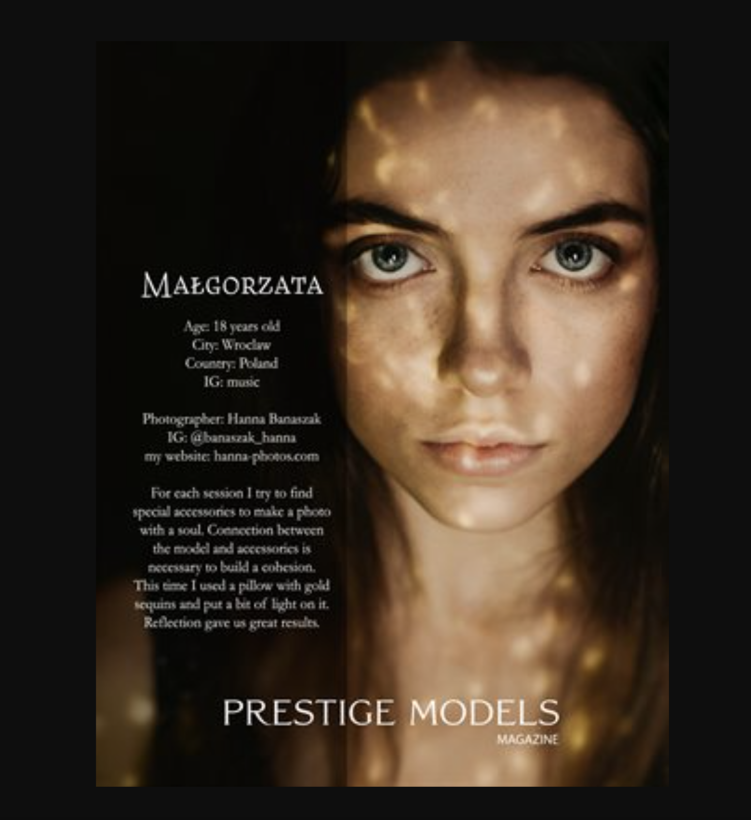 - feature in the international magazines, such as: Never Magazine, Malvie Magazine, Marika Magazine, MVIBE Magazine (cover🤩), Prestige Models Magazine, De Vision Magazine, Spellbound Magazine