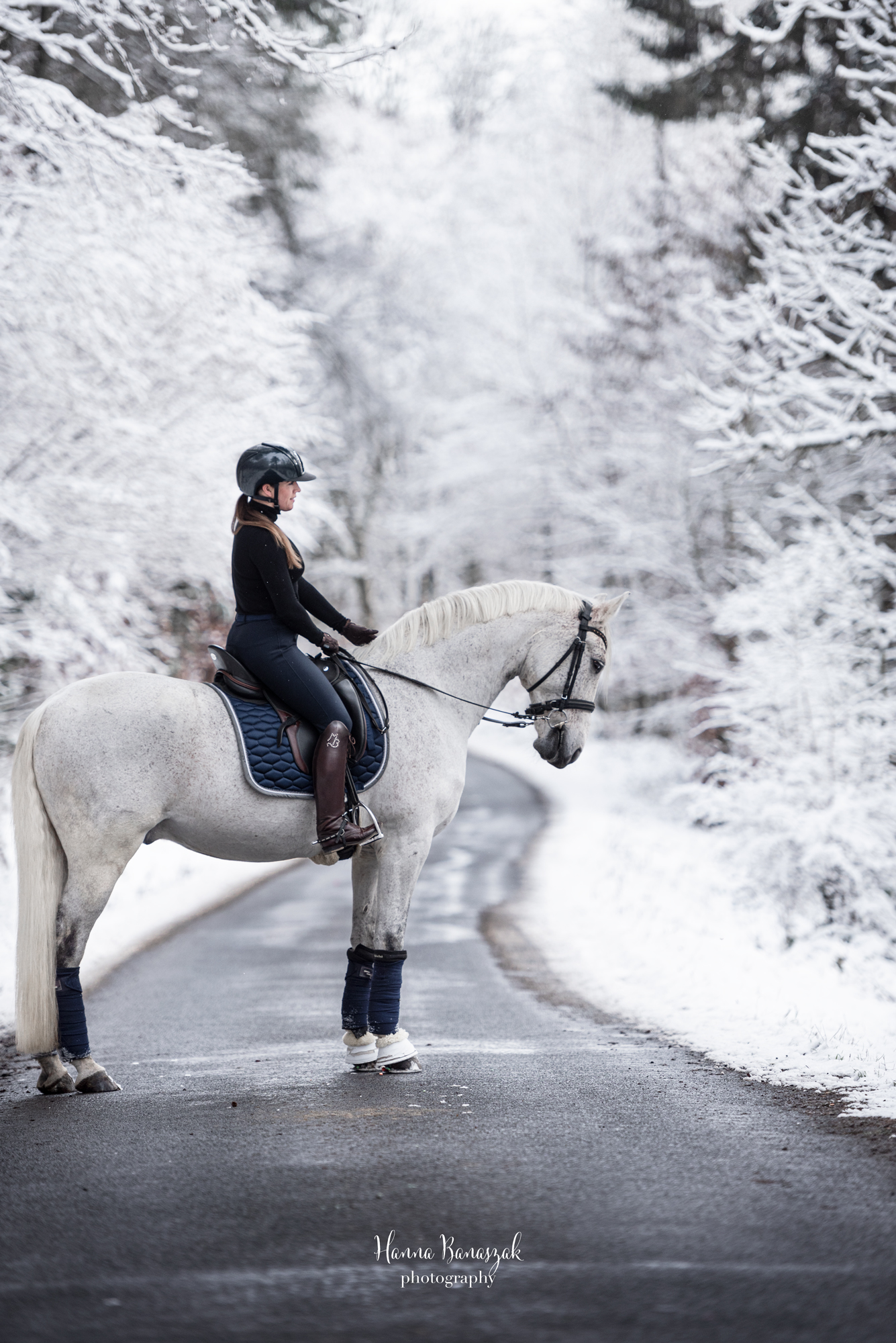 Przyznajcie się 😀 Czy kiedykolwiek byliście tak podekscytowany zimą, jak teraz? Zima z białymi gałązkami i ośnieżonymi drogami…czyż nie jest po prostu cudowna?! 10 lat temu to ja byłam fotografowana podczas galopu na śniegu, temperatura wynosiła -25 stopni! Można powiedzieć, że zwariowałam, ale jazda po śniegu przy czystym, błękitnym niebie i słońcu sprawiała mi mnóstwo radości. Oczywiście się zgadzam, że zwariowałam: D Ale było warto! Wierzcie mi lub nie, ale moim zdaniem spędzanie czasu na pasji nigdy nie nie jest czasem zmarnowanym. Czy wiecie, że jeździłam około 13 lat? Połowę życia spędziłam w siodle:D Takie piękne przeżycie! Dlatego tak bardzo lubię chwytać Wasze pasje. Wiem, ile to daje radości 🙂 I to dlatego byłam taka szczęśliwa, kiedy Kelly napisała mi pewnego dnia, że jest śnieg i czy możemy razem zrobić zdjęcia! Obserwując jej profil na Instagramie wiedziałam już, że jest Wulkanem pozytywnej energii i świetnym trenerem jeździectwa w Luksemburgu, do tego z ogromną miłością do koni. Spotkanie było niesamowite, ale efekty totalnie przerosły moje oczekiwania. Kelly świetnie się bawiła, a jej piękny Passion również wyglądał na bardzo zadowolonego z małego spaceru po zaśnieżonych polach;> Dziękuję Droga Kelly za zaufanie i wielką moc!