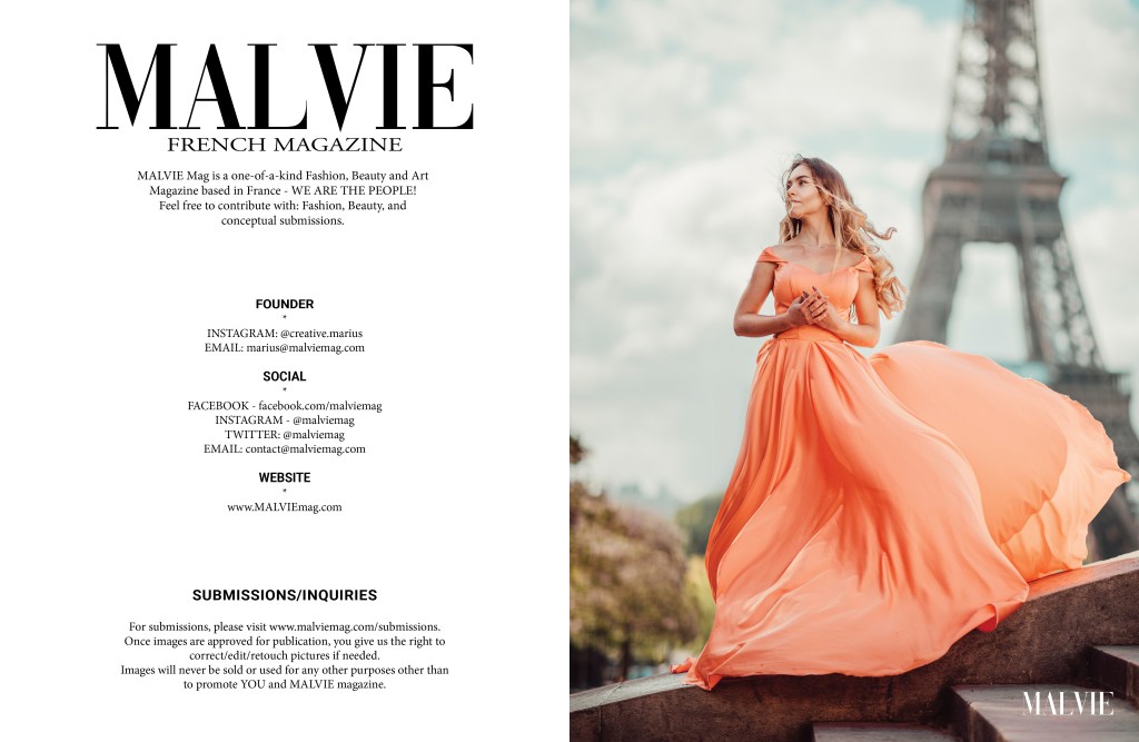 Cześć wszystkim! Wracam do Was z kolejną publikacją ❤️ Tym razem dostaliśmy strony z naszej sesji, zawartej we francuskim magazynie – Malvie 😊 Czekałam na wieczność (czyli 3 miesiące 😂 ) żeby pokazać Wam zdjęcia z Paryża! Sesja zdjęciowa została zorganizowana w długi weekend majowy z piękną Polką – Natalią. Nie mogłabym być szczęśliwsza! Cała seria została zainspirowana przepiękną suknią od wybitnej projektantki sukienek Margoconcept. Kiedy otrzymałam tę oszałamiającą kreację, wiedziałam, że muszę znaleźć specjalne miejsce na fotografie. Bardzo się cieszę, że mogłyśmy zrobić zdjęcia rano, bez ludzi w tle i co najważniejsze – ze słońcem! Cały czas mojej wizyty w Paryżu był deszczowy! Słońce zaświeciło nam tylko przez 2 godziny. Dzięki Bogu 🤩🥰 !