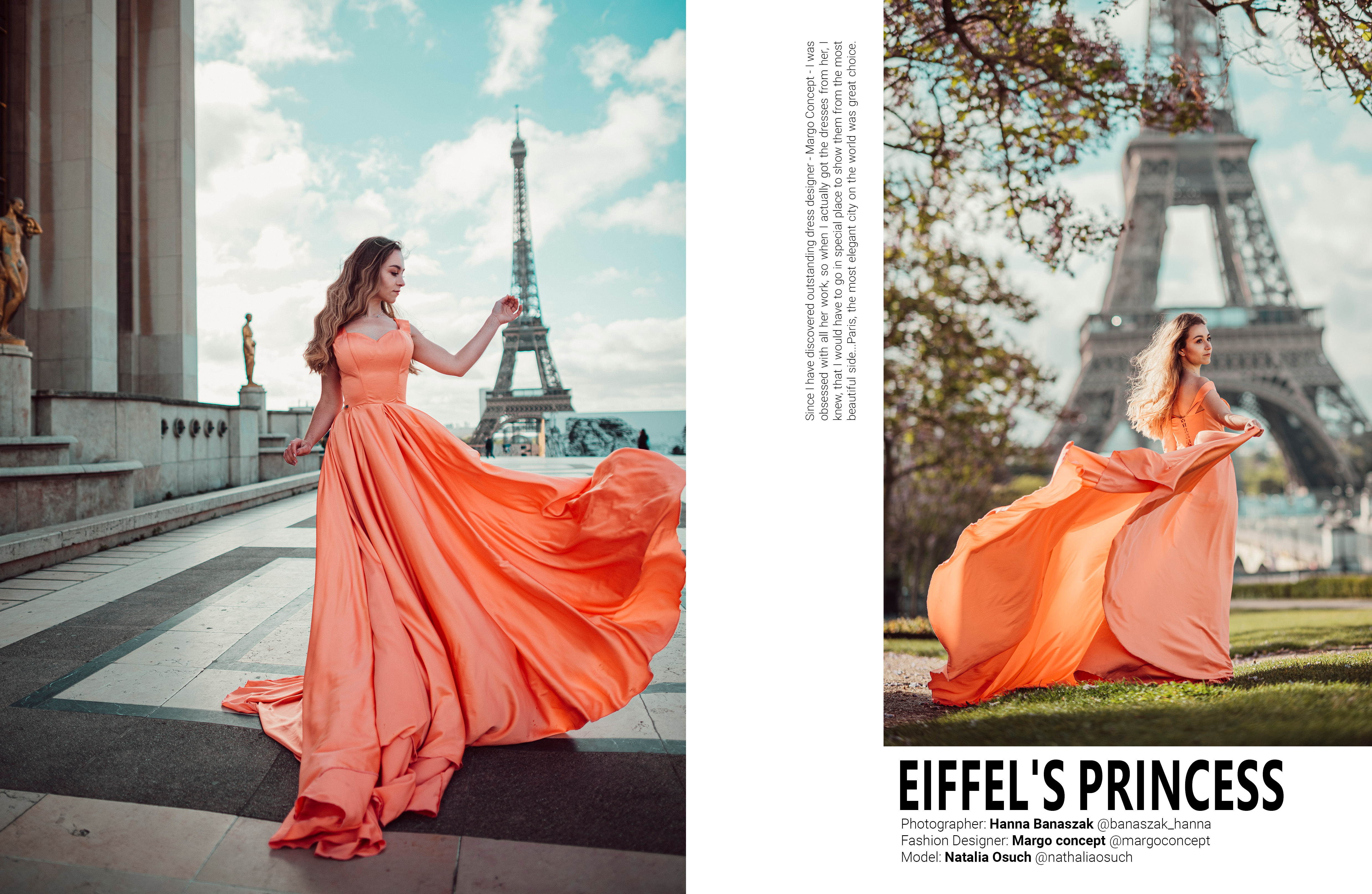 Hello Everyone! I am coming to you with the next publication ❤ This time we got the tear sheets from french magazine – Malvie 🙂 I was waiting for eternity (it means 3months 🤪😂 ) to show you pictures from Paris! Photoshoot was organized during the long weekend of May with beautiful polish girl – Natalia. Could not be happier! Whole serie was inspired by wonderful dress from outstanding dress designer – Margoconcept. When I received this stunning creation, I knew that I have to find a special place to make a photographs. I am very happy that we could make a shoot during the morning, without the people in the background and, what is the most important – with the sun! Whole time of my visit in Paris was rainy! We got the sun for 2 hours. Thanks be to God 🤩🥰 !